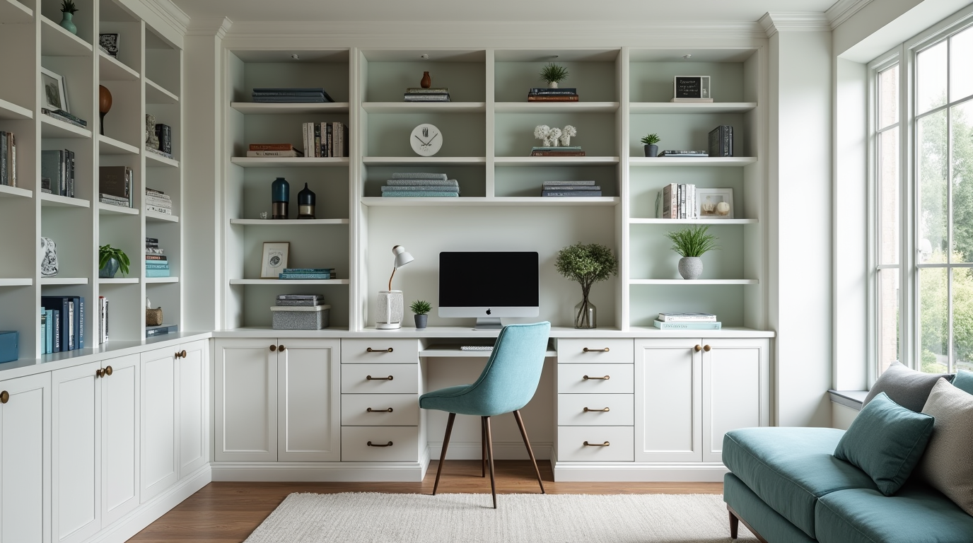 Now, the office feels both useful and pretty. Those built-in shelves aren’t just storage — they’re kind of the star of the room. Every time I walk in, I just feel happy seeing how put-together and calm it looks.